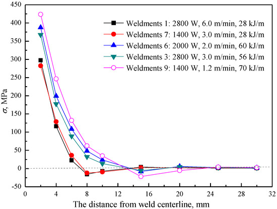 Figure 8 presents the longitudinal residual stress measurements for a series of laser welding, grouped by increasing heat input. Heat input considerably influenced residual stress. For welds 1 and 7 with the same heat input of 28 kJ/m, there was little change in the distribution and the maximum value of residual stress. The difference in the maximum tensile stress was less than 15 MPa. For the welds with different heat inputs, the maximum value of residual stress increased with increasing heat input. The width of the tensile longitudinal residual stress zone within the half plate was 7 mm with a heat input of 28 kJ/m, and 13 mm with a heat input of 60 kJ/m, which means that the stress gradient within the fusion zone of full laser penetration welding was steep. When the heat input increased, the energy absorbed by the unit length increased, which expanded the high temperature zone generation plastic deformation and the corresponding plastic deformation zone moved outside. Therefore, the tensile residual stress region increased.