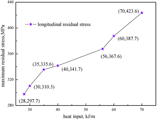 As shown in Figure 9, with increasing heat input, the maximum longitudinal residual stress gradually increased. The whole change process can be divided into three stages. During the first stage (heat input 28–35 kJ/m) and the third stage (heat input 56–70 kJ/m), the maximum residual stress changed markedly, which was mainly due to the large temperature gradient at high heat input and the small plastic deformation region at low heat input. When the heat input changed from 35 kJ/m to 56 kJ/m, the maximum longitudinal residual stress changed slowly. The deduction from these data is that the second stage may be the preferred heat input range for laser welding of 2-mm-thick titanium alloy plates when residual stress and other factors affecting welding quality are considered.