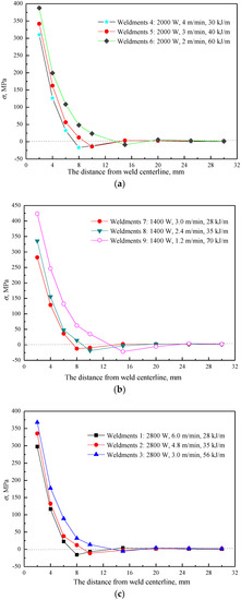 The longitudinal residual stress distribution with the same welding power: (a) 2000 W, (b) 1400 W, and (c) 2800 W.