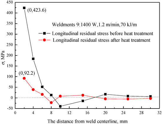 Comparison of the longitudinal residual stress before and after heat treatment. The maximum of longitudinal residual stress was reduced from 423 MPa to 92 MPa, a decrease of 78%.