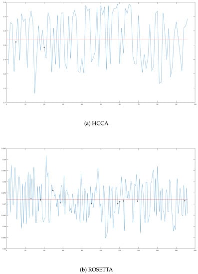 Results of the secret bit value guess by (a) HCCA and (b) ROSETTA. The blue line is the secret bit value guess and the horizontal red line is the threshold value for the secret bit value discrimination; points with a black circle indicate where the attack failed.
