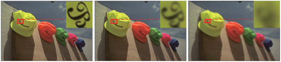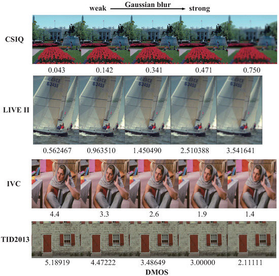In order to verify the consistency between the proposed image blurriness metric and natural blur images, we selected five Gaussian blur images from each of the four datasets, including CSIQ [25], Live II [26], IVC [27] and TID2013 [28], shown in Figure 6. Table 2 indicates that the proposed image blurriness metric has positive correlation with the difference mean opinion scores (DMOS), i.e., the subjective quality scores in CSIQ and LIVE II datasets, and negative correlation with DMOS those belong to IVC and TID2013 datasets. It can be concluded that our blurriness metric can precisely represent the blurriness of natural images and fit the subjective quality assessment of the HVS.
