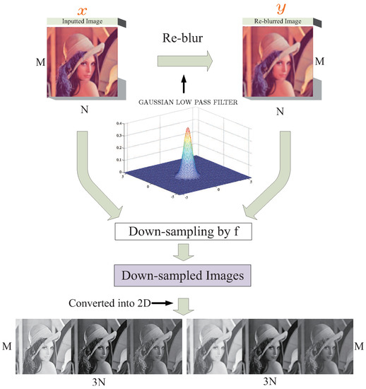 We decompose an image into the high-frequency part and the low-frequency part . represents the drastic part while represents the mild part. Thus the image grayscale variation would be sharper in drastic-change area. In order to focus on the main part that contributes to image quality and reduce the time cost, a down-sampling process for the inputted multi-dimensional image by a simple low-pass filter is applied. If , we define , where . Values outside the bounds of the image are computed by mirror-reflecting the image across the border. The filtered image should have the same size of the original image by restricting the points of filtering template in the original image. In addition, we convert both the multi-dimensional original image and the filtered, i.e., the re-blurred image into two-dimensional mode.