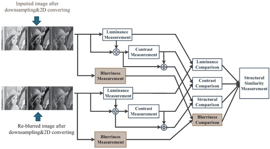 Considering the abundant information that images possess, the complexity of images can be represented based on their structure, noise and diversity [22] or based on fuzzy measures of entropy [23] or based on discrete wavelet transform decomposition [24], etc. In this paper, to represent the inputted image and the re-blurred image, we extract luminance, contrast, structure and blurriness of both the down-sampled 2D images, respectively. Then, we ameliorate the traditional structural similarity by combining the blurriness with luminance, contrast and structure in Figure 3. We would like to emphasize image blurriness in this subsection.