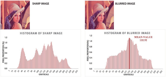 Sharp (left) and Gaussian blurred (right) images with their grayscale histograms.