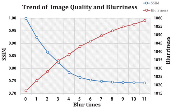Trend of image quality and blurriness with Gaussian blur times that varies from 0 to 11.