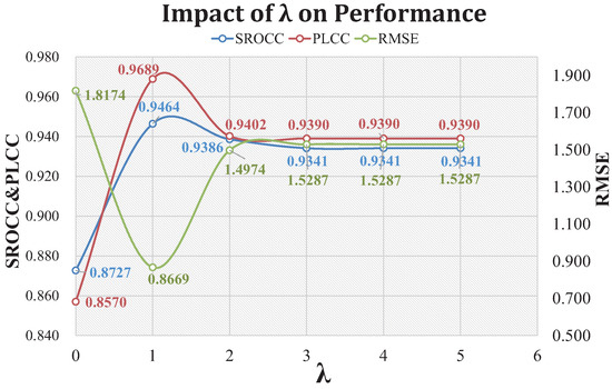 Analysis of performance of SROCC, PLCC and RMSE with varying from 0 to 5 on LIVE II dataset (145 Gaussian blur images), where represents the exponent coefficient of blurriness comparison function in Equation (10).