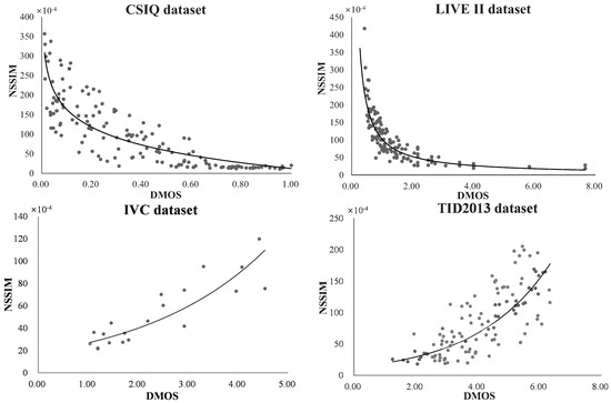 Scatter plots of DMOS vs NSSIM predicted scores on four datasets.