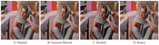 In this subsection, the re-blur method including blur type and filter parameters are discussed. We also discuss the exponent coefficients of luminance, contrast, structural and blurriness, i.e., , , and in Equation (10), to achieve the best performance of our proposed metric.