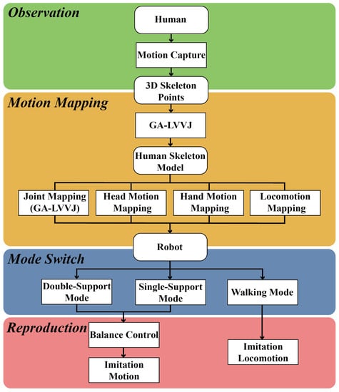 The framework of the proposed whole-body imitation system is shown in Figure 1. The whole framework includes four stages, i.e., the observation stage, the motion mapping stage, the mode switch stage and the reproduction stage. In the observation stage, human motions are captured by the RGB-D camera and 3D skeleton points of the human body are extracted. Then, in the motion mapping stage, the human skeleton model is constructed through GA-LVVJ, and the human motions are mapped to the robot body by using the proposed joint mapping (through GA-LVVJ), head motion mapping, hand motion mapping and locomotion mapping methods. It is worth pointing out that, since the information obtained from the skeleton data is limited and insufficient, auxiliary approaches (in addition to the GA-LVVJ method) for the head motions and hand motions of a humanoid robot are employed. In the mode switch stage, the robot will switch to the double-support mode, the single-support mode or the walking mode according to the state of the human skeleton model. In the reproduction stage, if the robot is in the double-support or the single-support mode, the mapped joint angles will be adjusted lightly through the balance control and then produce stable whole-body imitation motions. If the robot switches to the locomotion mode, the mapped locomotion data will be applied to replicate human rotations and displacements.