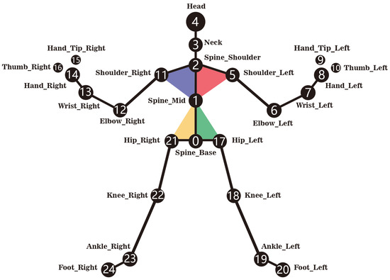 It is worth noting that since the human torso is not rigid, skeleton points 0, 1, 2, 5, 11, 17 and 21 in the human skeleton model may not all be in the same plane. As shown in Figure 4, to obtain more accurate joint angles, the torso of the human skeleton model is divided into four parts, i.e., the left upper torso, the right upper torso, the left lower torso and the right lower torso. Compared with a single-frame method (such as a method based on a single torso frame [28] or a fixed world frame [13,27]), the proposed method of torso segmentation yields more precise joint angles for the human skeleton model and improves the imitation similarity for local postures.