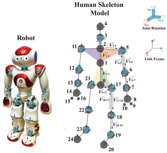 In order to map human postures to the robot through a geometrical analysis of the joint angles, the joint structures and each link frame of the human skeleton model should be established. The link frames of the human skeleton model serve as the references for the calculation of the joint angles for mapping. In order to construct them, virtual joints of the human skeleton model similar to those of the robot are established, as shown in Figure 4, regardless of what the real joint structures of the human body are. The axis of each joint is set collinear with or vertical to the vector of the mother link in the initial posture. Then, the link frames should be set in accordance with the axes of the joints at each intersection between a link and its child link. The origin of a link frame is located at the intersection between the link itself and its child link, as depicted in Figure 4. The postures of the robot and the human skeleton model that are shown in Figure 4 are defined as the initial postures in this paper. The LShoulderPitch and RShoulderPitch angles are equal to , whereas all other joint angles in the initial posture are zero. These joint angles are defined as the initial joint angles.