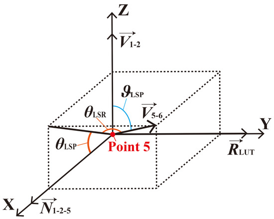 (1) Joints of Shoulder_Left: The angles of shoulder joints should be calculated with reference to upper torso links. The axis of LShoulderPitch is collinear with the vector . Because LShoulderRoll is the child joint of LShoulderPitch, its axis changes with the rotation of LShoulderPitch and is collinear with the the normal vector to Plane 2-5-6, , which is calculated as