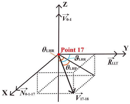 Then, is translated to the origin of the frame of the left thigh, point 18, and set collinear with the y-axis of the frame, as illustrated in Figure 8. is collinear with the z-axis of the frame. A reference vector that is collinear with the x-axis is introduced to complete a right-handed frame; this vector is obtained as follows: