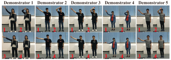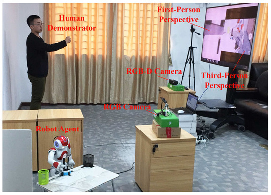 Generally, robotic imitation consists of three phases, i.e., observation, representation and reproduction [9]. The observation process usually relies on either marker-based or markerless visual capture systems or dynamic capture systems to acquire human motions. In a marker-based visual capture system, markers must be placed on the demonstrators to indicate the positions of their body parts [10,11,12,13,14], whereas a markerless visual capture system can directly extract 2D or 3D information from video frames [15,16,17,18,19,20]. The imitation system presented in [21] obtained motion data using the Xsens MVN dynamic capture system (Enschede, The Netherlands), which offers high precision but is inconvenient and expensive. Our real-time imitation system uses the Microsoft Kinect II (Redmond, Washington, USA), which costs much less and is more user-friendly, to capture 3D skeleton points and track the faces of the demonstrators.