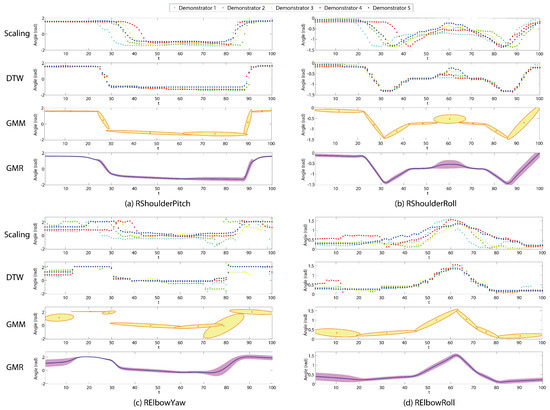 The imitation learning process of the hello motion. The first figure of each joint angle (i.e., RShoulderPitch, RShoulderRoll, RElbowYaw or RElbowRoll) depicts the scaling result of the raw datasets. The second figure depicts the DTW and scaling result of the datasets. The third one depicts the GMM encoding result. The fourth one depicts the generalized angle trajectory produced by GMR.