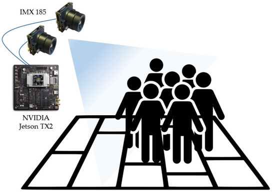 The schematic concept of this people-counting system is shown in Figure 1. The angle type of the camera was a side view and the angle was between 30 and 60 degrees. The height of the camera was between 3 and 5 m. We used two IMX 185 cameras [13] to construct a stereo camera. The camera was connected to the NVIDIA Jetson TX2 [11] and attached to the ceiling.