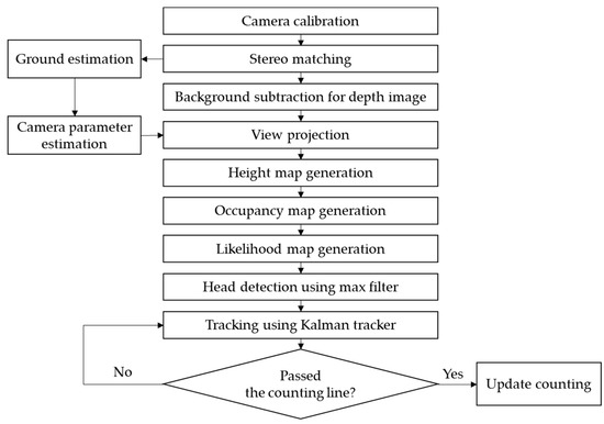 The flow chart of the proposed method is shown in Figure 2. The camera calibration process is a step used to acquire the camera parameters of each camera. The camera parameters were used in stereo rectification [17] and view projection. We applied the stereo-matching algorithm [18] to the rectified stereo image to obtain the disparity map and convert it to the depth map. The background subtraction algorithm was applied to the depth map to only extract the moving object. The height map and the occupancy map were obtained by projecting the moving object onto the top view [15]. By using these maps, we generated the likelihood map based on the Gaussian distribution and found the detected head using the local max filter [15]. The detected head was tracked using a Kalman filter-based tracker [16] and determined whether it had passed the counting line. We will describe the main algorithms of our method in this section.