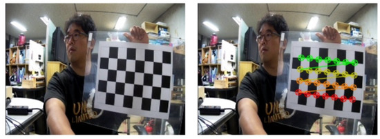 In Equation (1), the pair of coordinates from the image coordinates and the corresponding points of the world coordinates make it possible to acquire the intrinsic camera parameters. To obtain the position of the point for each coordinate system, we used a uniform chess board as shown in Figure 4. The corner point of a chess board is easy to extract because its characteristics are clear. The coordinates of the corner points extracted from the image are image coordinates, and the distance between the actual corner points of the chessboard is the world coordinate. Substituting these pairs of coordinates into Equation (1), an intrinsic parameter can be obtained. We obtain an undistorted image pair by correcting the distorted image using the intrinsic parameters [21].