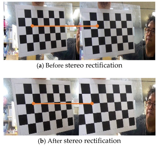 Figure 5 shows the result of rectifying the stereo image. Figure 5a shows the left image and right image before. The positions of the corresponding points on the horizontally drawn orange line were different. Figure 5b shows the left and right images after stereo rectification and it can be clearly seen that the positions of corresponding points on the orange line were the same.