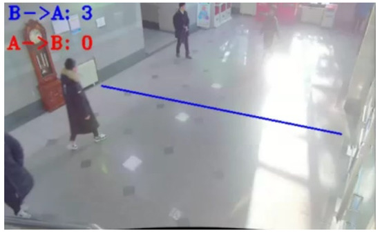 To measure the people-counting performance of the proposed method, the camera was installed in a place with a lot of floating population. The experimental sequence was in HD resolution, consisting of 23 videos in five minutes. The counting line was set on a major route that passed a lot of people, as shown in Figure 6. Updating the counting number every time a person crossed the counting line caused the counting number to increase abnormally, for example, a person hanging around near a counting line. Therefore, we set a benchmark to count the first time a person crossed a counting line and created a ground truth.