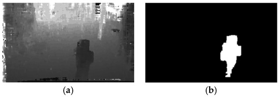 Background subtraction result: (a) depth map, and (b) background subtraction result.