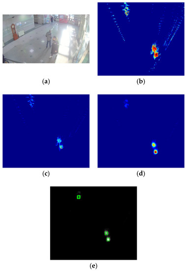 where O and H are the occupancy map and height map, respectively, μ is the mean, and σ is the standard deviation. Figure 9d shows the likelihood map. It shows the head with the highest value and that the farther away from the head, the more the value decreases. The likelihood map is scanned in a rectangular unit of a certain size, and the head was detected when the center value of the rectangle was the local maximum value. Figure 9e shows the results of the head detection.