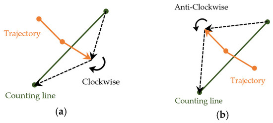 In order to count a person, it is necessary to define the relationship between the counting line and the trajectory of the object. In the proposed method, the direction of the object was calculated when the trajectory of the object and the counting line intersected. Figure 10 shows two cases where the trajectory of the object crossed the counting line. Figure 10a shows the direction in which the object’s last position and the counting line draw was clockwise. Figure 10b shows the counterclockwise direction in the same way. We used this method to calculate which direction the object crossed the counting line and increased the count for that direction.