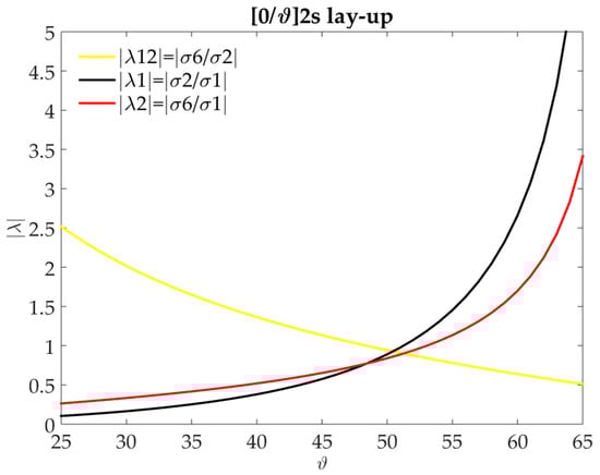 Bi-axiality ratios, λ, for different angles, θ, of [0°/θ]2s laminates.