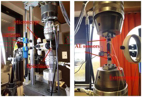 Experimental set-up. DIC—digital image correlation; AE—acoustic emission.