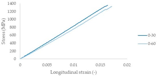 Initially, tensile quasi-static tests were performed in order to obtain the mechanical properties of the angle-ply laminates, summarized in Table 2. Both laminates have an equal amount of 0° layers in the loading direction, and taking into account classical laminate theory, it is expected that the [0°/30°]2s laminates display a higher ultimate strength and elastic modulus than the [0°/60°]2s laminates. However, the increase in strength acquired by the [0°/30°]2s laminates compared to the [0°/60°]2s laminates is only 4.1% and the increase in stiffness is equal to 5.2%, showing that the two laminates lead to very similar mechanical behavior, when only the mechanical properties are taken into account. In Figure 3, the stress–strain curves of the two laminates are plotted.