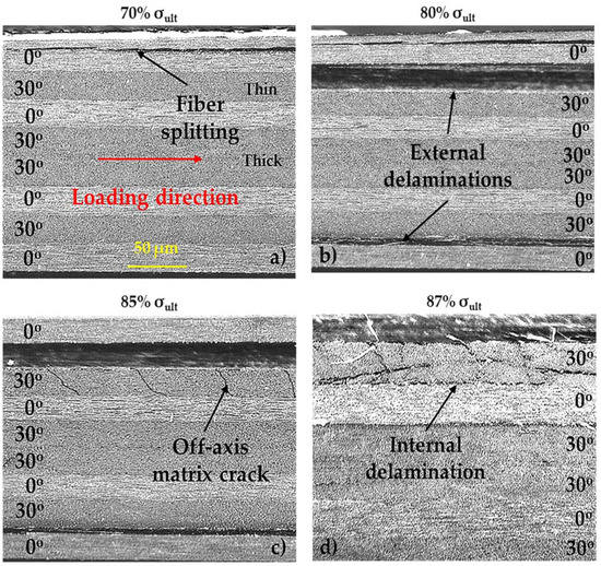 Starting with the [0°/30°]2s laminates, until 70% of σult, no damage was observed by the microscope. As shown in Figure 4a, at this stress, fiber splitting at one of the external 0° layers was observed, and when the stress reached a value equal to 75% of σult, interlaminar delamination between this outer 0° layer and the adjacent thin 30° layer was observed (external delamination), with no prior matrix cracking of the off-axis layers. Around the same stress level, fiber splitting at the second external 0° layer occurred and some limited matrix cracks in the thick 30° layer (two middle 30° layers) were recorded, which increased negligibly until the end of the test. At approximately 80% of σult, a second delamination between the external 0° layer and the adjacent off-axis layer was visible on the opposing side (Figure 4b). The fiber splitting at both external sides came to a saturation point at a stress equal to 85% of σult, whereas the length of the delaminations was increased incrementally until the end of the test. At around 85% of σult, multiple matrix cracks were recorded in one of the thin 30° layers along a limited length of the layer in the area of the previously formed delamination (Figure 4c), and this led to the appearance of a third internal delamination between this layer and the inner 0° layer shortly afterwards, at around 87% of σult (Figure 4d). The growth of all of these delaminations resulted in the final failure of the material, after catastrophic fiber breakage.