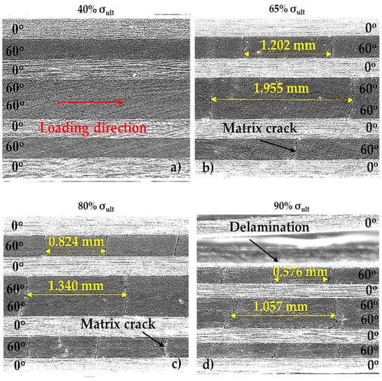 Damage state of [0°/60°]2s laminates at (a) 40%, (b) 65%, (c) 80%, and (d) 90% of σult.