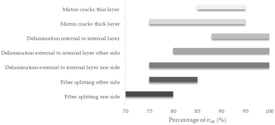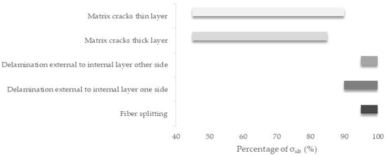 Taking all of the above into consideration, in Figure 6 and Figure 7, the total damage progression during the quasi-static tests for the [0°/30°]2s and the [0°/60°]2s laminates, respectively, is shown as a percentage of the applied stress. The loading periods during which the different damage modes appeared in the test are plotted, defining which modes appeared first and which were overlapping in a specific percentage of the stress. The values of the stress are averaged, with the deviation being very small, in the range of 1–1.5%. In both of the laminates, the final catastrophic failure occurred because of brittle fiber breakage in the loading direction.