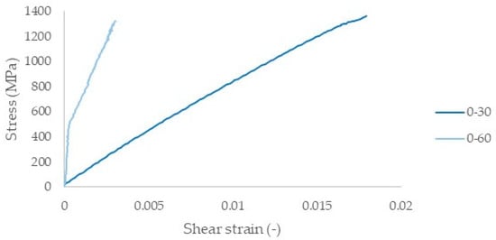 Based on all of the above, it is clear that the damage sequence in composite materials is not straightforward and unique, and that it strongly depends on the developed stress states. It has been already shown in literature [,] that shear has a detrimental effect on the mechanical response of composite materials under fatigue loading. However, it is proven from the current work that when shear is dominant, a detrimental influence regarding the appearance of delaminations exists even under static loads. High shear stresses and strains seem to lead to intralaminar shear debondings, which quickly propagate into multiple interlaminar delaminations. In Figure 8, the engineering shear strains that are developed in the two laminates as measured from the DIC software are plotted versus the applied stress. For the calculation of the shear strains, the average strains for the total amount of analyzed points on the surface of the specimen were taken into consideration. It is clearly shown that in the [0°/30°]2s laminates, high shear strains occur, leading to internal shear debondings and, consequently, to early delaminations.