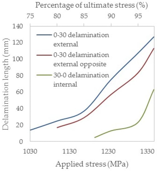 For a more quantitative damage description, and in order to better highlight the detrimental influence of shear, Figure 9 and Figure 10 show the evolution of the length of the different delaminations that appeared in the [0°/30°]2s and the [0°/60°]2s laminates, respectively, versus the applied stress and also versus the percentage of σult, as measured with the microscope. The values on the horizontal axis range between the value at which delamination was first observed and the value at which the final scan was performed, at a stress equal to approximately 98% of σult.