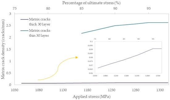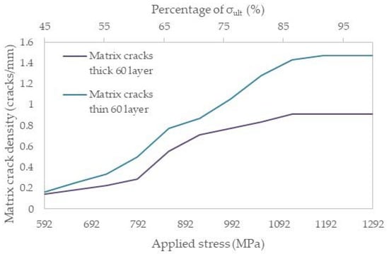 On the other hand, in the [0°/60°]2s laminates, matrix cracks occurred at around 600 MPa (45% of σult) both in the thin and thick off-axis layers. However, it is remarkable that a higher crack density was measured for the thin 60° layers. The rate of the measured crack density reached an asymptote after a stress level of 900 MPa (68% of σult), and the cracks came almost to a saturation after 1100 MPa (83% of σult).