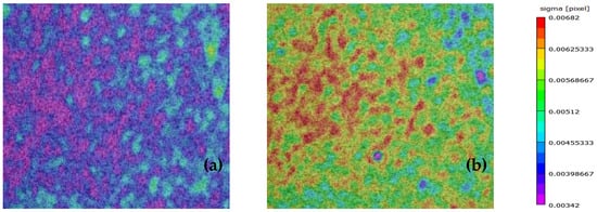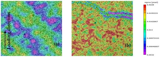 The same applies for the [0°/60°]2s laminate, for which in Figure 14, the σ pattern at two subsequent pictures at around 90% of σult is shown. The higher σ values in Figure 14b in comparison with Figure 14a indicate out-of-plane movements, confirming the appearance of delamination at this stress level also in this case. At the same time, higher σ values were obtained for the [0°/30°]2s laminates, coming to good agreement with the fact that at a stress value equal to 80% of σult, delaminations of a greater extent were observed, leading to higher out-of-plane movements. However, these observations are only qualitative, indicating that a change in the pattern of the σ value can be a sign of the appearance of delaminations.