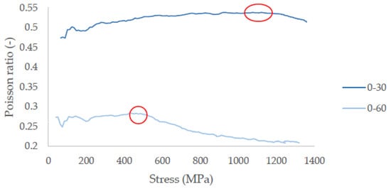 In Figure 15, the evolution of the Poisson ratio versus the applied stress is plotted for both of the testing configurations. In the beginning of the test, the Poisson’s ratio values corresponded to the theoretically calculated values using classical laminate theory. However, the evolution of the Poisson’s ratio was different for the two angle-ply laminates, as damage accumulated during the quasi-static test. As shown in Figure 15, in the [0°/30°]2s laminates which are characterized by higher shear strains, the Poisson’s ratio was higher and was continuously increasing until the stress level at which delamination occurred. After a stress of 1000 MPa, a decreasing trend was monitored coinciding with the appearance of delaminations, as indicated in Figure 15. On the other hand, in the [0°/60°]2s laminates, the Poisson’s ratio was constant in the initial part of the static test and it started decreasing at a stress value close to the point that matrix cracking occurred, having lower values than the [0°/30°]2s laminates. The above proves that even global mechanical properties, like the Poisson’s ratio, can qualitatively indicate the transition from moderate to severe damage.