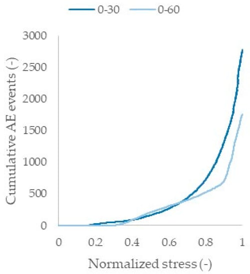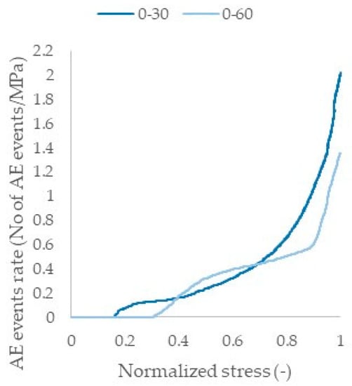 Looking at Figure 16, the first remark is that AE activity was recorded for the [0°/30°]2s laminates quite a lot earlier than for the [0°/60°]2s laminates. Additionally, more AE events were in total recorded for the [0°/30°]2s laminates, in comparison to the [0°/60°]2s ones. The deviation between the two laminates is more clearly shown after 70% of σult, after which extensive damage started occurring in the [0°/30°]2s laminates. In order to achieve a more direct correlation of the AE activity with the stress increase in both laminates, in Figure 17, the AE events rate is plotted versus the normalized stress. The AE rate is calculated with respect to the applied stress and is therefore expressed as “number of AE events per MPa”.