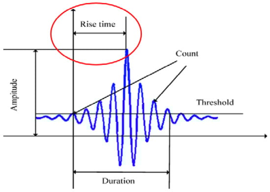Of course, the AE difference between the two laminates is not only quantitative, but also qualitative. This means that the signals related to specific damage sources have certain patterns, and a features analysis is necessary in order to distinguish the damage modes and to detect the damage mode transition. It is proven that the two angle-ply laminates under consideration have different features related to their damage, which is shear dominated for the [0°/30°]2s laminates, whereas it is matrix cracking dominated for the [0°/60°]2s laminates. In the current study, the rise time proved to be the most characteristic feature to prove that different multiaxiality and damage modes lead to different shapes of the AE waveforms. Undoubtedly, different AE features exist, like, for instance, the frequency and the energy, which may contribute to a more complete damage characterization. However, the rise time and its evolution was proven to be the most indicative AE feature for proving the variation of the AE waveforms when variable stresses and damage mechanisms are dominant in the CFRE laminates. The rise time is defined as the time interval between the first threshold crossing and the signal peak, as shown in Figure 18, for a typical AE waveform.