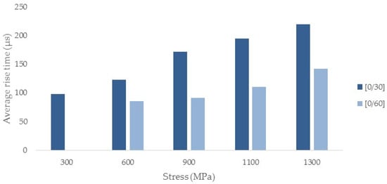 In Figure 19, the average rise time values for the two angle-ply laminates measured at specific stress levels during the quasi-static tests are plotted. It should be mentioned that, as fracture in composites is a stochastic phenomenon, large scatter in AE is inherent. However, what is more important is whether consistent trends of the average values of the AE features are obtained, which is the case for the rise time recorded throughout the quasi-static tests for both laminates under consideration.