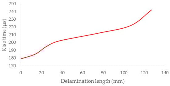 Evolution of average rise time versus the delamination length in the [0°/30°]2s laminates.