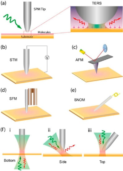 (a) Diagram of TERS, and corresponding SPM technology as (b) STM (c) AFM (d) SFM and (e) SNOM. (f) Three different kinds of excitation and collection: (i) Side excitation and side collection, (ii) bottom excitation and bottom collection and (iii) top excitation and top collection [61].
