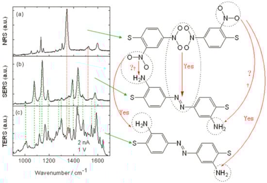 Assisted by surface plasmons (SPs), 2,4-DNBT underwent two different types of reductions, one nitro group of 2,4-DNBT was reduced to an amine, while the other group was reduced to an N=N bond as shown in Figure 2. Figure 2a shows the normal Raman scattering spectrum (NRS) of the 2,4-DNBT powder. Combined with the experimental and theoretical Raman spectra given in Ref [62], it can be determined that the peaks at 1306 cm−1 and 1336 cm−1 correspond to the NO2 stretching modes of the two nitro groups, while the peak at 1524 cm−1 is attributed to the simultaneous vibration of the nitro groups. Based on the SERS spectrum for 2,4-DNBT (Figure 2b), the disappearance of these Raman peaks related to nitro groups clearly indicates the existence of a surface catalytic reaction. Several new Raman peaks are strongly enhanced and the Raman peak at 1432 cm−1 is attributed to the N=N bond. However, the dynamics of the process are hard to determine. The TERS spectrum in Figure 2c differs significantly from the NRS and SERS of 2,4-DNBT.