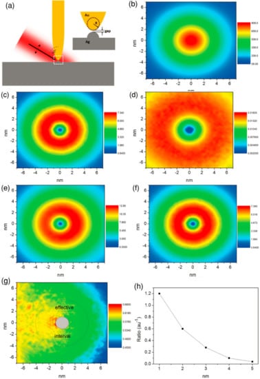 (a) The diagram of TERS system, (b) the stimulated electric field intensity at the center, (c) the stimulated electric field gradient intensity along tip axis (d) the ratio between electric field gradient and electric field intensity, (e) the stimulated electric field intensity along the substrate, (f) the stimulated electric field gradient intensity along the substrate, (g) the ratio between electric field gradient and electric field and (h) the distance dependent ratio [62].