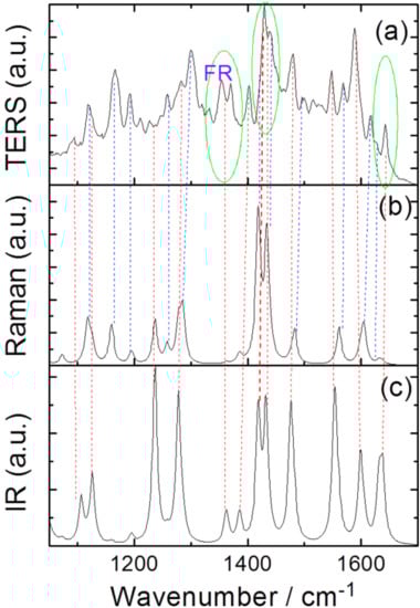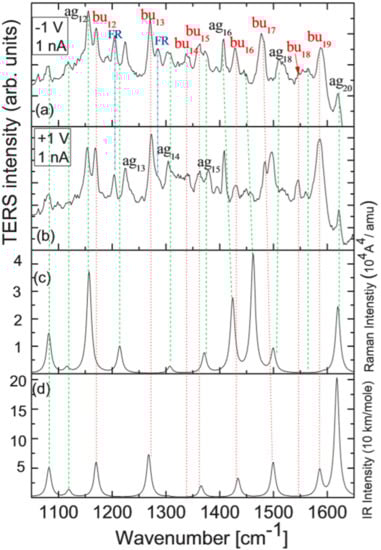 Comparing the experimental TERS spectrum with calculated Raman and IR spectra in Figure 7 shows that all of the peaks can be assigned and the IR-active modes are activated, owing to the electric field gradient effect (molecular quadrupole transitions).