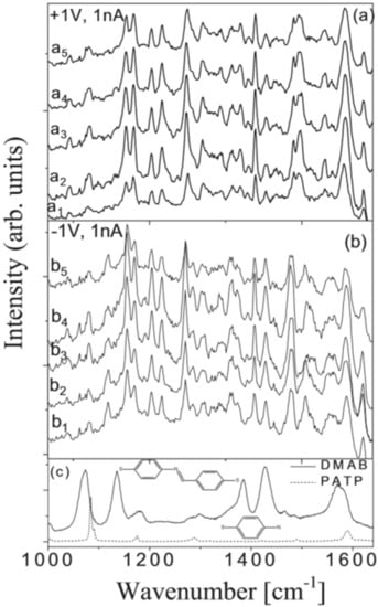 The TERS measurements for PATP on an Au film at different bias voltages in Figure 6 showed that the product was stable and there was little influence on the polarity of the bias voltage, indicating that the product should be structurally symmetric. Moreover, it is obvious that TERS can provide more information than SERS as more Raman peaks appear. Based on previous studies, DMAB can be generated from PATP on Au NPs, while the SERS for PATP on an Au film is similar to the NRS for PATP [71]. The difference in the probabilities for the chemical reaction on different substrates occurs because the plasmonic enhancement on bare Au film is weak.