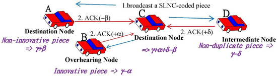 Recently, the symbol-level network coding (SLNC) technique has been proposed to support robust transmission and stimulates more active simultaneous transmissions [17]. For alleviating the aforementioned problems, the SLNC-based CCD approach, for example, CodeOn [18], CodePlay [19] and so forth, has been proposed [17,18,19,20,21]. In every control time slot, each vehicle broadcasts the reception status of content data in a safety message to its neighbors. For coordinating the broadcast among vehicles, these SLNC-based CCD approaches adopt the prioritized relay selection scheme to calculate the value of utility, which is defined as the number of valuable SLNC-coded content pieces that a node contributes to its neighbors through its broadcast. However, these approaches do not differentiate content pieces of a node from those of its neighbors. If each node owns the same number of content pieces, these SLNC-based CCD approaches will terminate their operations because the utility value between any two nodes is zero, in spite of some content pieces are distinct indeed.
