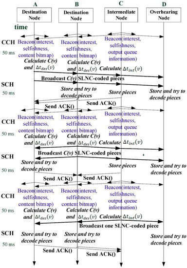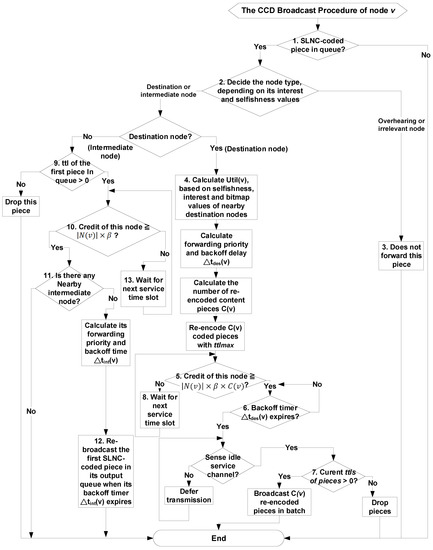 As shown in Figure 6, steps of the CCD broadcast procedure are listed below. Please note that intermediate node v forwards its first SLNC-coded piece in queue only after each destination node i has re-broadcast C(i) pieces because its backoff timers, that is, , is longer than that, that is, , of each destination node i.